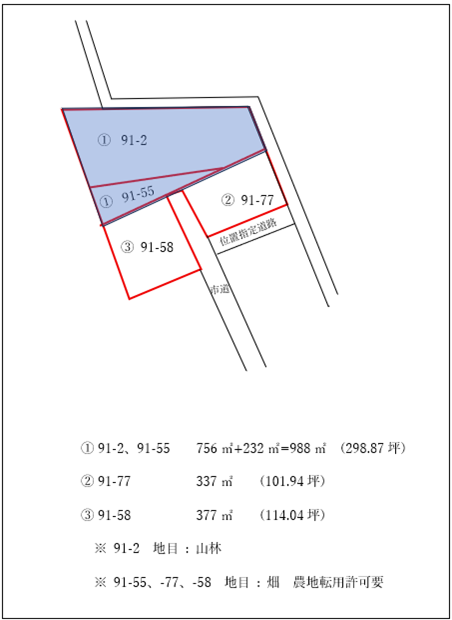 | 【 住 所 】 那須塩原市清住町91番2、91番55 【 地 目 】 山林(91-2)、畑(91-55) 【登記簿面積】988u(298.87坪) 【実測面積】 1032.29u(312.26坪) 【建ぺい率】 60% 【容 積 率】 200% 【私道負担】 無 【道路付け】 市道 【都市計画】 区域内/未線引 【用途地域】 第一種中高層住宅専用地域 【そ の 他】 地番91-55農地転用許可・要 【 電 気 】 東京電力 【 ガ ス 】 個別プロパンガス 【上 水 道】 公営水道 【下 水 道】 公共下水道 【取引形態】 仲介物件 ※上水道ー水道引込工事費及び加入金要 ※下水道ー受益者負担金要 u当り239円 |